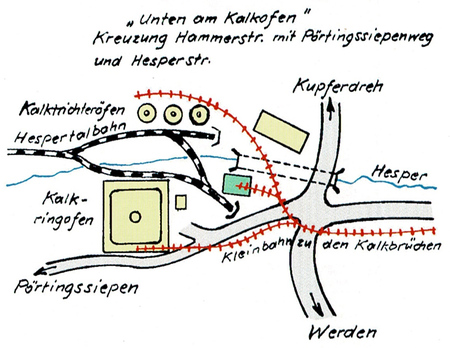 es näher an die Wasserstraße der Ruhr. Die in Velbert-Hefel liegende Zeche Stolberg errichtete 1870/71 an der Kreuzung Hesperbrück drei Kalktrichteröfen, 1883/84 dann einen der damals modernsten