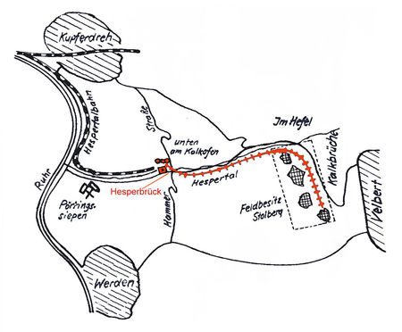 Rohstoffgrundlage. Kurz danach verlängerte sie die Pferdebahn durch das Hespertal bis zur Hütte in Kupferdreh. Doch die 1857 eröffnete Strecke änderte nichts daran, dass die Gruben nicht so ertragreich waren wie erhofft. Schon 1872 schloss die letzte Erzgrube in Velbert.